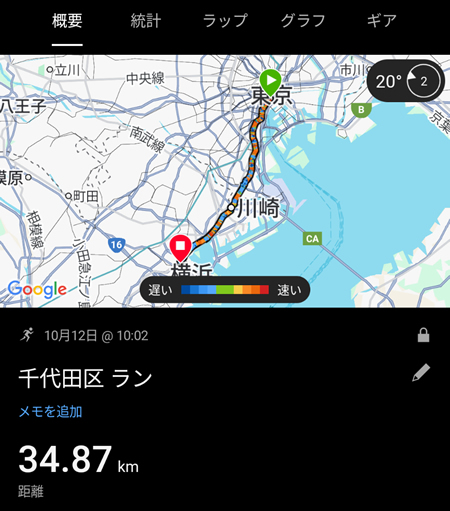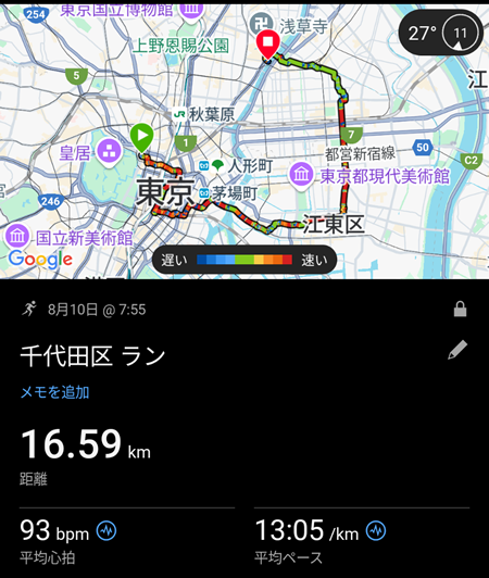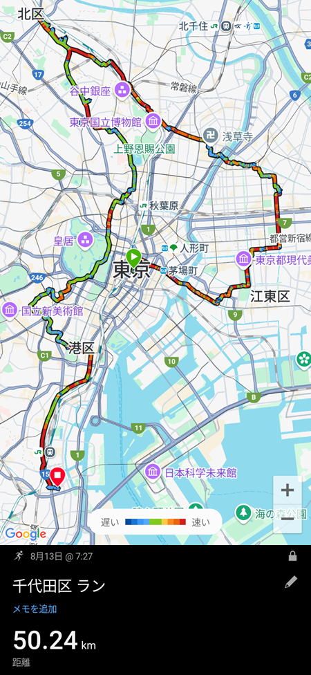 ![]() 今回の軌跡 ![]() 出発時の東京八重洲口 ![]() ![]() まずは一社目、富岡八幡宮 まだ早い時間なので人影は殆どなかった ![]() 出発地点から10キロ程進んで亀戸天神社へ ![]() 隅田川を渡って墨田区から台東区へ ここから10キロ程進んで王子神社を目指す ![]() ![]() ![]() 途中寄った七社神社 物凄く手入れの行き届いた神社だった ![]() アリアハンからロマリアの距離を移動した疲労感でなんとか王子神社へ ![]() ![]() 王子神社から東京方面へ戻る途中、白山神社へ 白山神社のすぐ近くには根津神社があるのでここで半分の5社を廻れたことになる ![]() ![]() 根津神社へ到着 ![]() 秋葉原近くにあるお馴染みの神田神社へ 根津神社から神田神社を目指す道中が疲労のピーク(30キロ位)で蒸し暑さを相まって 足が非常に重かった ![]() お茶の水のビューポイント 次は日枝神社へ向かうのでここから大手町を目指す ![]() 死にそうになって日枝神社へ 日枝神社の近くには赤坂氷川神社があるのですぐに2社廻れる ![]() 丁度17時頃に赤坂氷川神社へ 残すところ2社(芝大神宮・品川神社)となったが日没までに全て廻れるか怪しくなってきた ![]() 六本木のスペイン坂から麻布台ヒルズ前を通過する最短ルートで芝大神宮へ 最後の品川神社は5キロ先なのでここから気合を入れて走る ![]() ![]() 18時35分頃品川神社へ 日没の10分前位でほぼギリギリだった ![]() ![]() 新馬場駅付近の銭湯で汗を流してから蒲田での飲酒風景 この日の総歩数は約8万歩(60キロ位)で10万歩には遠く及ばずだった 品川神社から蒲田まで走って移動していれば9万ちょっとまでいけていたと思うので 帰宅時に少し遠回りすれば10万歩達成できたかもしれない |