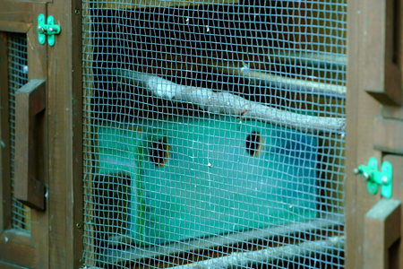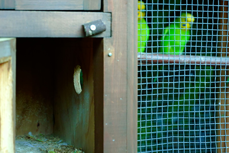 ![]() ![]() 開放した巣箱を内見するインコ ![]() 下部に設置した様子のおかしい方の巣箱 |